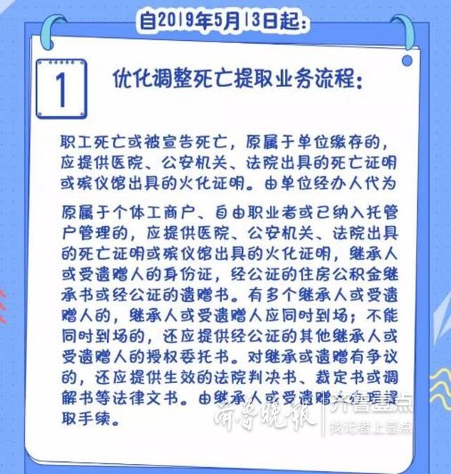 具体来看,将《济宁市住房公积金提取管理办法》第二十一条调整为:职工死亡或被宣告死亡,原属于单位缴存的,应提供医院、公安机关、法院出具的死亡证明或殡仪馆出具的火化证明。由单位经办人代为办理提取手续。