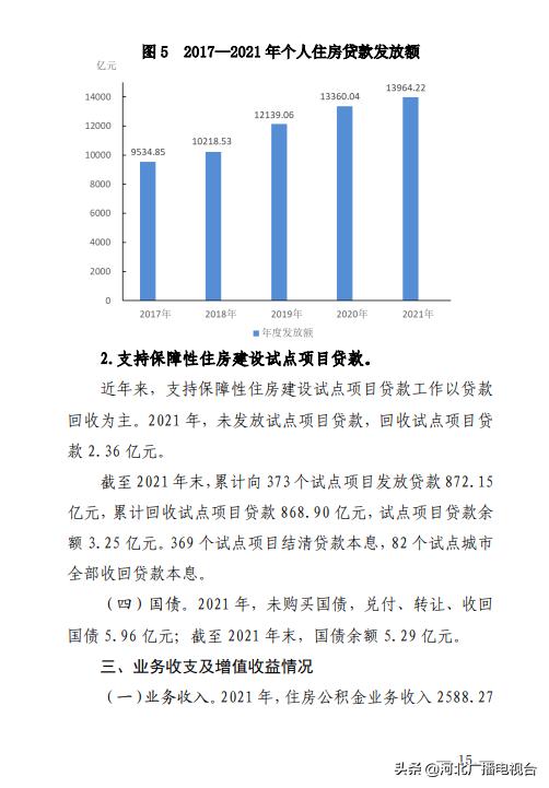 个人住房贷款方面显示,2021年,发放住房公积金个人住房贷款310.33万笔,比上年增长2.50%;发放金额13964.22亿元,比上年增长4.52%。截至2021年末,累计发放住房公积金个人住房贷款4234.71万笔、125302.81亿元,分别比上年末增长7.91%和12.54%;个人住房贷款余额68931.12亿元,比上年末增长10.62%;个人住房贷款率84.18%,比上年末减少1.13个百分点。