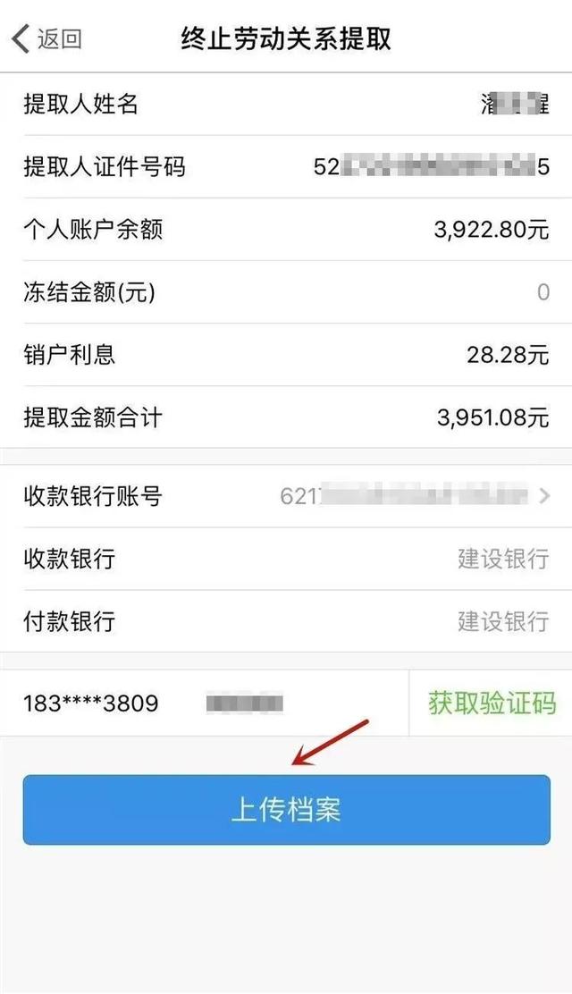 进入终止劳动关系页面,填写银行卡号,然后点击【上传档案】