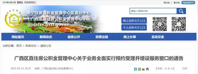 4月23日,广西区直住房公积金管理中心发布一则关于业务全面实行预约受理并增设服务窗口的通告: