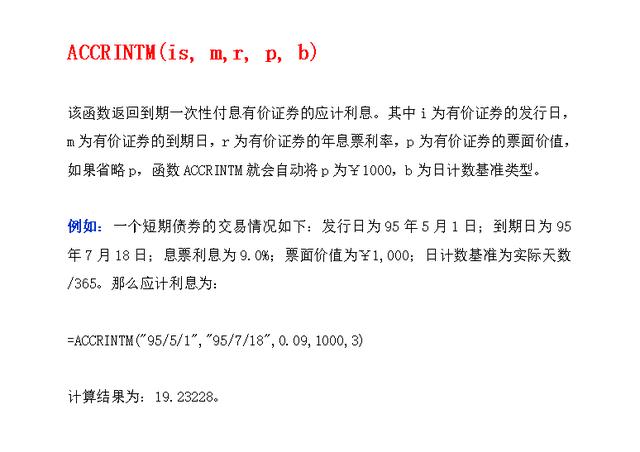 如:ACCRINTM函数(计算到期付息证券的应计利息)、COUPDAYS函数(计算包括结算日期的付息期间的天数)、CUMIPMT函数(计算两期之间所支付的累计利息)