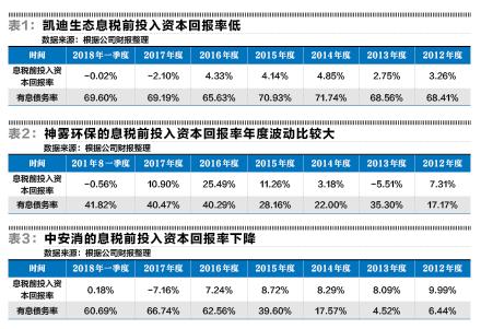 从表2的数据可以看出,神雾环保的息税前投入资本回报率年度波动比较大,这与其主要业务是以承接各类环保工程项目在不同年度之间的结算波动有关,但总体而言,可以覆盖债券利息,其存在的问题是资金时间节点的差异会导致阶段性债券违约风险。