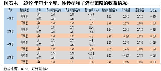 为了回顾19年两种策略的表现,我们以一个季度3个月为持有期,每个季度第一天构建组合,最后一天平仓,期间组合的收益来自票息和资本利得。同样假设每次重新构建组合,1年、5年和10年期的久期不变,分别为0.7、4.5和8.5,1年期和10年期的配比分别为51.28%和48.72%。具体情况如下表: