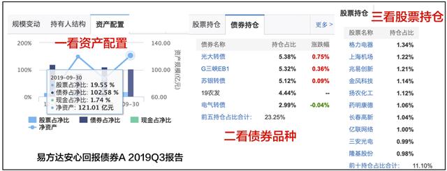 这样分类以后,大家是不是感觉就很一目了然了?比方以某三方基金APP“大家都在买”排名第一的易方达安心回报债券A进行举例,就很容易判断出它是一只二级债基。一看资产配置,最新三季度债券和股票品种都有;二看债券品种,三季度前五债券品种包括了光大转债、苏银债券、电器债券以及G三峡EB1、19农发;三看股票持仓,三季度前十大持仓包括格力电器、上海机场、兆易创新、金风科技、扬农化工、药明康德、长春高新、亿联网络、三安光电、隆基股份,合计占比11.10%。“三看”以后可以分析出易方达安心回报债券A是一只“股性”很重的二级债基,股市涨跌对其影响极大,所以每日净值涨跌是不是像名字一样的“安心”就另当别论了。