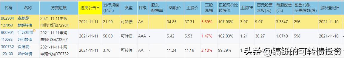11月11日将有3只可转债申购,分别是麒麟转债(127050)、苏租转债(110083)、设研转债(123130)