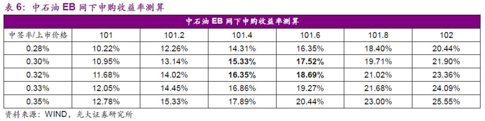 中石油EB中签率预计在[0.28%,0.35%]区间,中枢在0.32%。网上网下配售比例为3:7,因此理论上有70亿元供投资者网下申购。