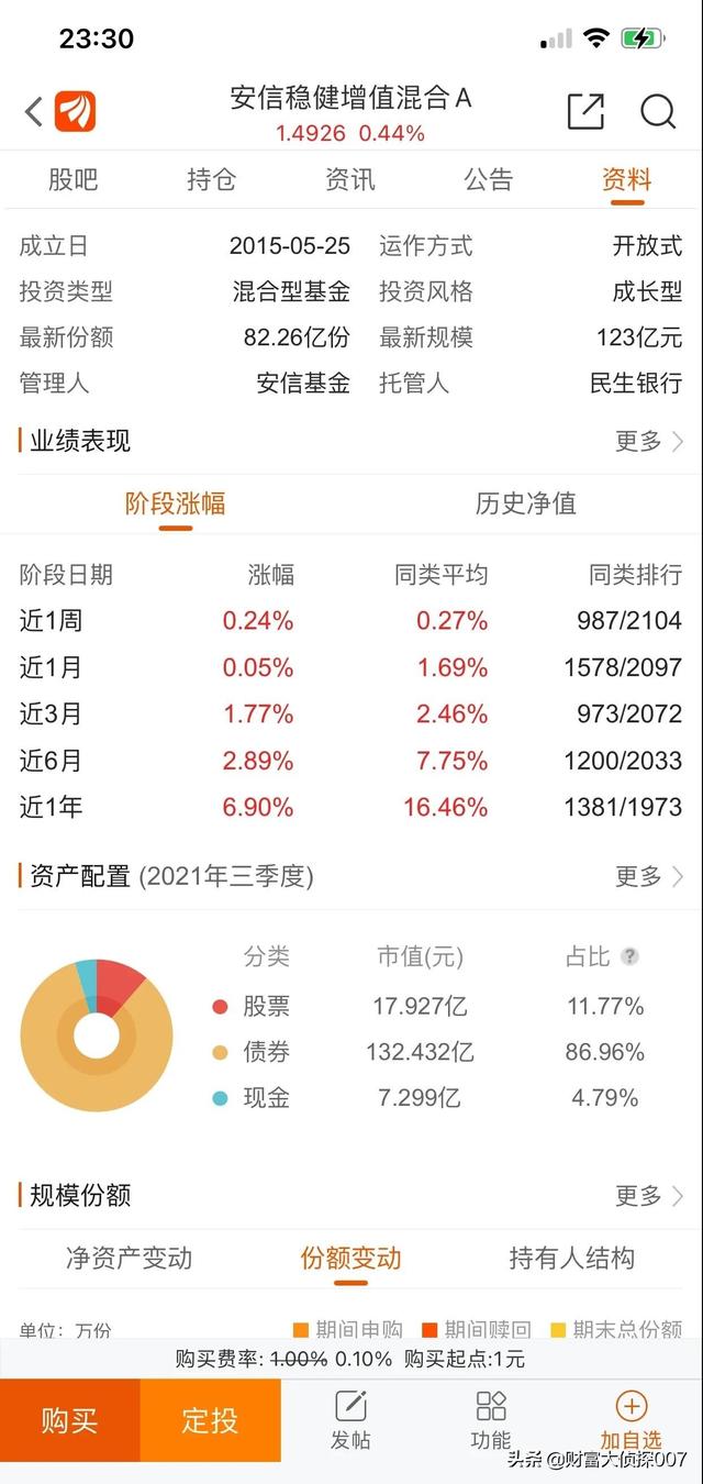 侦探哥先说结论:这只基金其实是“固收 ”产品,股票的资产占比只有11.77%,债券的占比是86.96%,很明显就是偏债混合型基金,所以不能拿来和偏股混合型基金相比较。偏债混合要看的是业绩是否平稳增长。