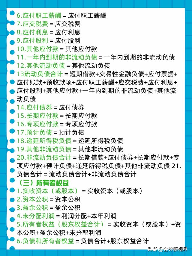 5.所有者权益(股东权益合计)=实收资本(或股本) 资本公积 盈余公积 未分配利润