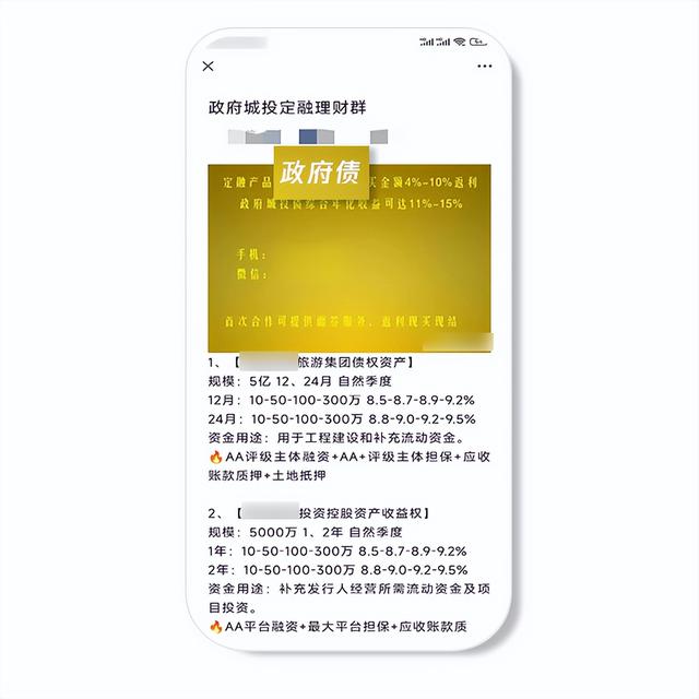 ● 微信公众账号发布的内容中,禁止高收益理财欺诈内容,如推广不正常的高回报理财产品或导流欺诈项目。其中的“导流欺诈项目”通常表现为未明确日化或年化收益,但通过可疑的引导性内容,诱导用户添加个人微信或外链推广高收益理财产品。