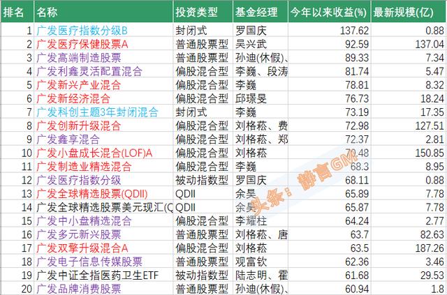 今年以来收益最高还是要数医疗类基金-广发医疗保健股票(广发医疗指数分级B为封闭式场内基金,先不管这个),其次是新能源类基金-广发高端制造股票,再次是综合类广发利鑫灵活配置混合。
