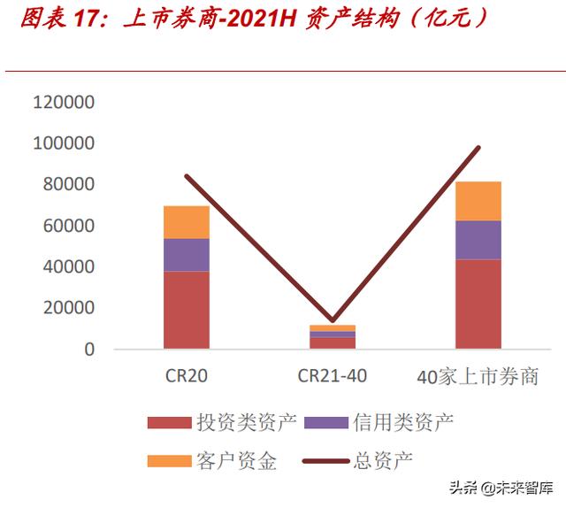 龙头投行品牌效用持续强化,全产业链综合服务能力打造核心竞争力,随着 北交所设立,中型券商投行预计迎来业务机遇。资管新规下券商大集合业务 转型已见成效,券商间产品结构形成分化带来收入增速差异,券商设立资管 子公司谋求公募基金牌照,加强资产端竞争力,CR20 券商资管业务净收入 同比 35%,而 CR11-40 中小券商收入同比-12%,预计短期仍承压,尚需寻找 差异化新业务增长点。利息净收入方面,券商两融业务与经纪业务共振,科 创板转融通等带动融券业务需求提升,中大型券商资本相对充足且机构业务 优势下优质券源获取能力较强,CR3、CR20 净收入同比 51%、24%,21-40 位券商同比 2%。投资类业务收入增速梯队差距明显, CR3、CR20 及中小券 商同比分别 19%、 16%、-2%,中大型券商一方面公募基金发行向好,受益 于参控股公募带来的合营联营投资收益提升,同时衍生品业务带来增量空间。 总体来看龙头各业务与同业差距逐步拉大,中小券商尚需探索差异化发展之 路。(报告来源:未来智库)