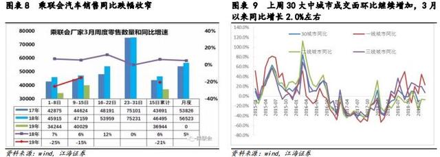 消费方面,根据乘联会数据显示,3月第二周全国乘用车市场零售达到日均4.0万台水平,同比增长达到-15%,跌幅较第一周收窄10个百分点,相比于17年和18年3月零售走势,一般月初偏低,月末拉升现象明显,3月后两周同比有望继续改善。第二周乘用车主力厂家批发达到日均4.75万台水平,同比增长达到-16%,跌幅收窄16个百分点,厂家批发销量表现明显改善。由于4月开始的增值税降税政策利好,因此3月的经销商进货热情提升,未来2周的批发增速仍有望继续大幅改善。上周30大中城市商品房成交面积继续增加,环比增长17%,3月以来同比增长2.2%,较2月同比回落,但较1-2月均值-1.5%明显回升,短期房地产销售难继续大幅回落,对房地产相关消费也有支撑。