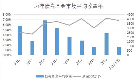 我们统计了从2012年到2020年4月的债券基金平均收益率。作为市场辅助对比,也选择了沪深300指数走势。