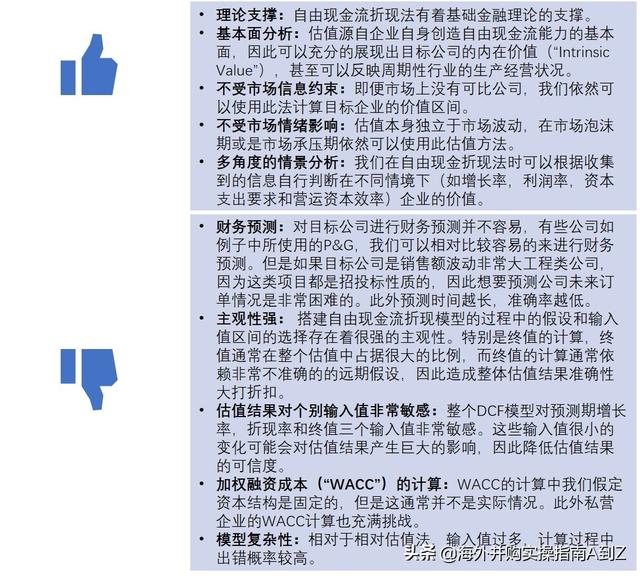 优缺点:杠杆收购法是自由现金流折现法的逆过程,通过对收益率的倒推来判断估值区间是否合理。下表中就是一些杠杆收购估值法的一些优缺点。