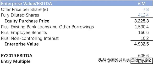 此外公司账上3.24亿英镑的现金,需要注意的是在这个交易中,Apollo同意RPC在交易结束前支付每股8.1便士的股息。这会对整个交易产生两个影响:第一,公司账上现金将减少;第二,公司的净资产将减少,也就意味商誉会增加。除此之外,RPC公司还有部分待售资产。为了简化模型,我们假定Apollo会在交易完成的同时将这部资产立即出售。最后我们得出公司可使用现金为3.17亿英镑现金,我们假设Apollo会在交易中全部使用。