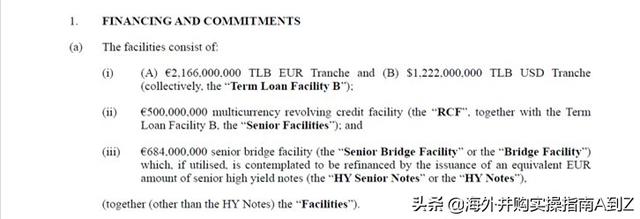 我们还是以Apollo的报价为例,Apollo在其报价中提供了由巴克莱银行牵头(“Barclays”),多家银行为项目融资提供的融资承诺函(“Commitment Letter”)。整个交易中,银行团将为Apollo提供5亿欧元的循环流动贷款(“Revolving Credit Facility ”简称“RCF”),21.66亿欧元的B类定期贷款(“Term Loan B”简称“TLB”)[9],12.22亿美元的B类定期贷款和6.84亿欧元的过桥贷款(“Bridge Loan”)。各家银行参与融资项目和提供的融资比例请参见下表