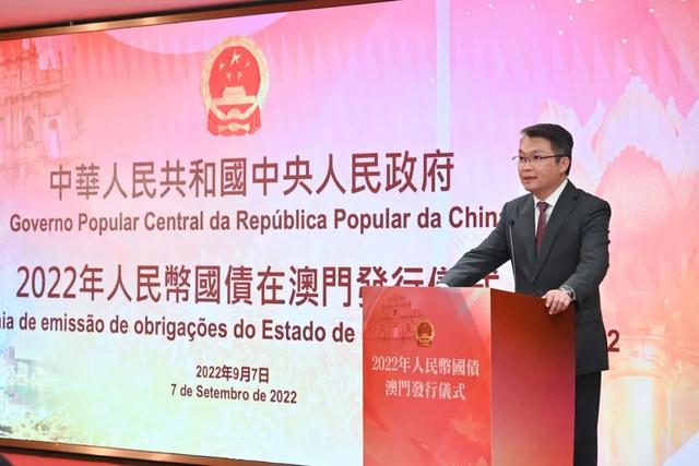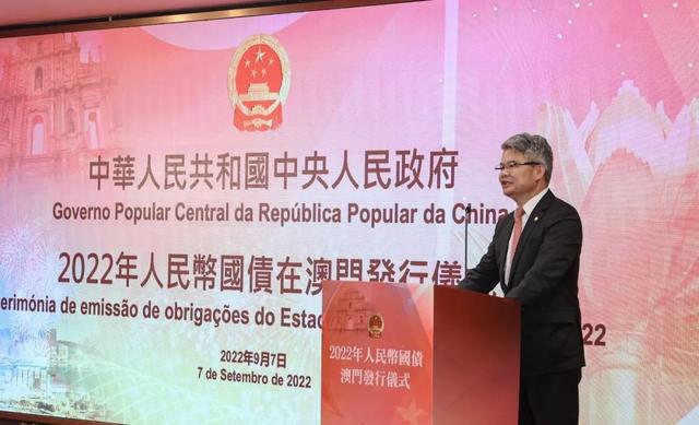 中央人民政府2022年人民币国债在澳门发行仪式,今(7)日上午在中国与葡语国家商贸合作服务平台综合体举行,行政长官贺一诚、中央政府驻澳门联络办公室主任郑新聪、外交部驻澳门特派员公署特派员刘显法、国家财政部金融司司长王克冰、澳门经济财政司司长李伟农以及相关金融机构代表出席了发行仪式。李伟农、王克冰、中国银行副行长林景臻,以及交通银行副行长郭莽在仪式上致辞。