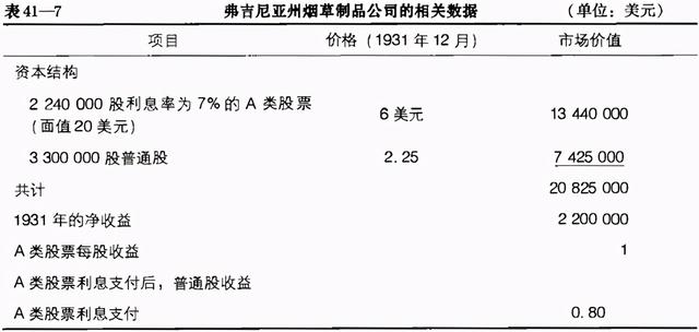 弗吉尼亚州烟草制品公司(Tobacco Products Corporation of Virginia)。和前面两个例子一样,在这个案例中,公司最近报告股票的市盈率为10倍。但是,1931年该烟草公司的收益全部来自于其租赁给美国烟草公司的部分资产,这使公司从1923年起的99年里每年所得的租金为2500 000美元。由于美国烟草公司完全有能力支付租金,该项年租金收入相当于优质投资的收益。因此公司的市值远远超过10倍市盈率下的股票市值。这就意味着1931年12月市场对烟草制品公司的估值远远低于公司的实际价值。(按照摊销的标准计算,租赁价值实际上约为35600 000美元。)该公司还持有大量美国雪茄商店的股票,虽然这些股票后来一文不值,但是这些额外持有的股票根本不会减少公司来自于对美国烟草公司租赁的价值。见表41—7。该种情况的相对重要意义