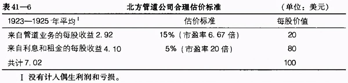 这一事实表明必须以这种特别的估价标准来判定每股收益,因为按照通常我们所用的 “10倍市盈率” 的标准所得出的结果是毫无意义的。每股80美元的金边债券投资会带来3. 20美元的每股收益,而以10倍市盈率计算这80美元的“价值”只有每股32美元,因此结果是十分荒谬的。显然, 对北方管道公司这一部分来自于其 债券持有收益的估值标准应当高于来自于其不稳定的管道业务收益的估值标准。 因此对于北方管道公司合理的估价标准可遵循如表41——6所述。管道收益表现不佳,其估值应当采取较低的标准。利息和租金收益必须根据其实际资产价值所产生的收益进行估值。这种分析显然表明,在1926年北方管道公司股价为64美元时,其市值大大低于其内在价值。