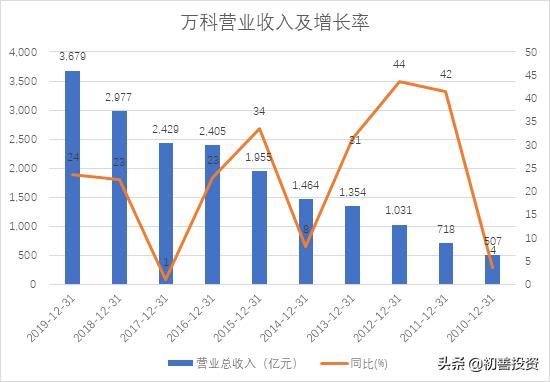 首先成长性方法,万科的业绩具有明显的周期性,这里的周期性不是收入增长为正或者为负,作为行业龙头,万科的营业收入是持续增长的,但是受到房地产的调控,增速有高有低。可以明显看到,2010年、2014年和2017年营业收入增速只有个位数,其他年份营业收入增长率基本高于20%。