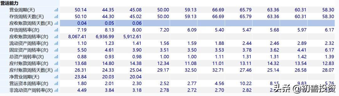 运营能力指标。运营能力体现了公司的管理能力,一般指存货周转率、资产周转率等,这里具体公司具体分析,可能关注存货周转率多一些,也可能关注应收账款周转率多一些,还可能关注固定资产周转率多一些。