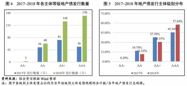 级别迁徙方面,2016年以来房地产市场整体爆发式增长,主力房企销售业绩良好、库存补充积极,资产、收入和利润规模基本均呈大幅增长态势。这使得2017年以来,房地产企业信用等级调整以调升为主。2017年,8家主体信用等级上调至AA ,10家主体信用等级上调至AAA;2018年,9家主体信用等级上调至AA ,7家主体信用等级上调至AAA,级别的大规模上调,也导致了高信用等级主体发债占比的上升。