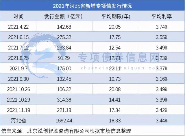 截止2021年11月19日,河北省2021年已发行新增专项债券共计1692.44亿元;已发行48期,已发行项目批次数达1296个。