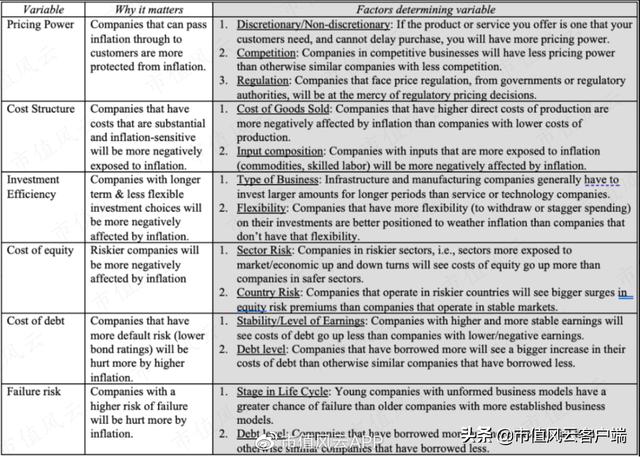 简而言之,通货膨胀对公司价值的影响归结为通货膨胀对预期现金流、增长和风险的影响,下表列出了确定通货膨胀对价值最终影响的因素: