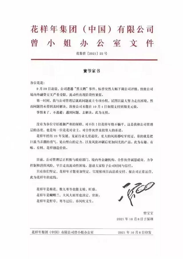 10月8日,花样年实控人发了一份“家书”,她表示自己“绝不躺平”。现在这么做,有可能是博弈,也可能是没办法。