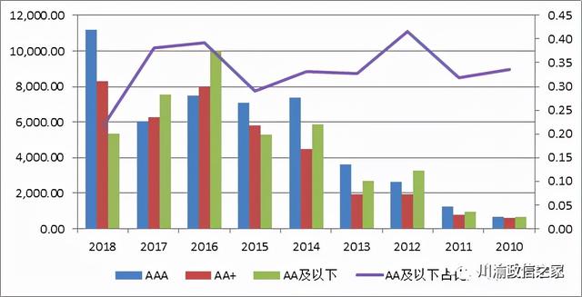 下面的图分别展现了从2010年到2018年依照外界评级和行政层级开展区划的城投债的发行状况,从这当中可以看得出一部分基本规律: