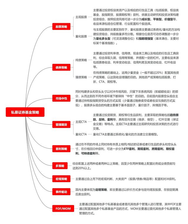 为了应对更加多样化和丰富的市场,私募证券投资基金的投资策略也越来越多样化。私募证券基金的策略总体可分为9大类,分别是股票策略、债券策略、市场中性、管理期货、套利策略、多策略、宏观策略、事件驱动、FOF/MOM。