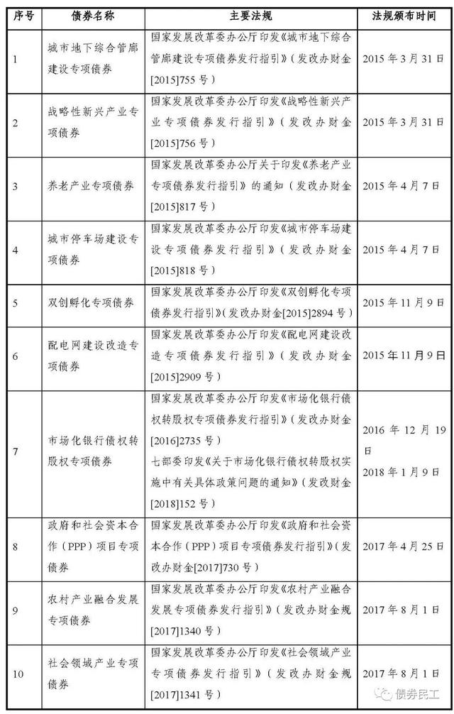专项债券是国家发改委2015年开始推出的创新企业债券产品,2015年推出了6个专项债券品种,2016年推出了1个专项债券品种,2017年推出了3个专项债券品种,2018年至今,暂无新的专项债券品种。目前国家发改委专项债券已经有10个品种,详见表1: