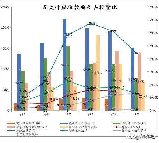 以工行、建行、兴业、招行、北京银行和青岛农商行来分析,2015年到2019年,工行、建行、招行的投资资产占比相对稳定,在21%到25%的区间波动。兴业、北京银行和青岛农商行占比高、波动大:北京银行从23%增长到36%,青岛农商行从20%增长到36%。兴业银行连续五年依次为49%、54%、48.6%、43%、38%,其中最大的变量是投资资产旗下的应收款项。