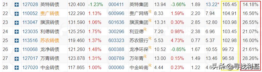 由于和科伦转债类似的转债很少,可信度不够,因此我们退而求其次,筛选同评级、转股价值类似的转债。下图黄框为转股价格列,红框为转股溢价率列。
