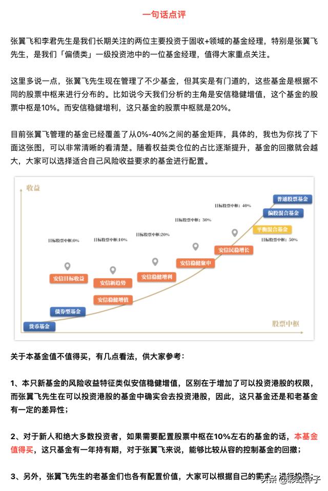 张翼飞先生目前仍旧是我们一级投资池中的一位基金经理,他的产品属于值得买级,这只新基金的股票中枢是10%,如果需要配置固收 类型的产品的话,还是值得重点关注。
