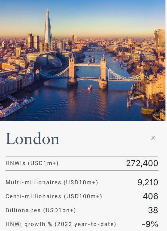 百万富翁最多的前10个城市中有一半在美国。但仔细观察数据会发现,纽约市在2022年上半年失去了12%的高净值人士,而旧金山湾区则增加了4%,同时成为全球亿万富翁最多的城市。