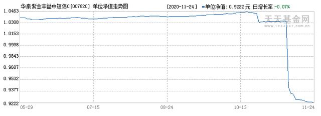 如华泰紫金丰益中短债C (007820)累计收益率在11月10日出现断崖式下跌,累计收益率从9日的-0.56%下跌到-9.25%,呈L型走势,11月24日累计收益率为-11.25%,而同类平均收益率为1.21%。基民表示感觉像“进了基金的地雷阵”。