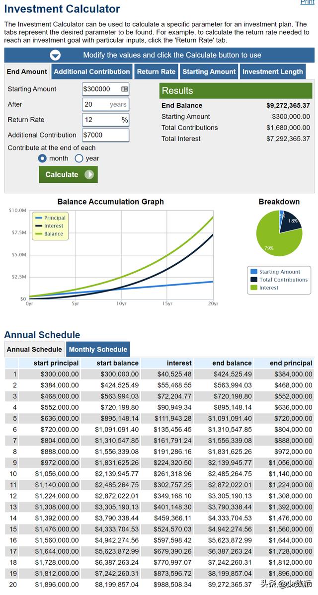 在这里还要给大家推荐一个网站,将自己现有的可投资产、每月新增投入(即结余)、投资时长以及预期年化率填上去,就可以了解自己之后年份的收益。你可以试着填入不同的新增投入数额,看看复利给你带来的回报有多不同,看完后说不定你会把储蓄值再度提高许多,因为支出的弹性其实是非常大的。比如说以初始本金 30w,年化收益 12%,每月投入 7000 块,期限 20 年来计算,最终财富将达到 927 万元,是的你没看错 !你的总投入只有 168 万,但最后你拥有了 927 万。