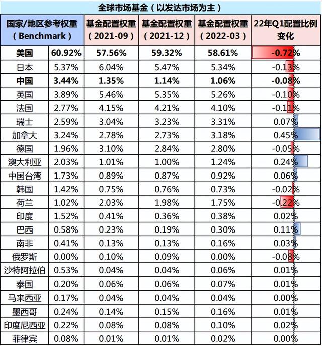 但如果把眼光聚焦在美联储加息预期最强的4月,发达市场股市净流出了353亿美金,而新兴市场股市反而获得了129亿美金的净流入。面对违背常识的结果,我们不禁会思考,难道是因为全球市场的投资人在卖出非美的发达市场股票,买入美国股票吗?但从2022年Q1末全球市场基金的配置来看,恐怕并非如此。