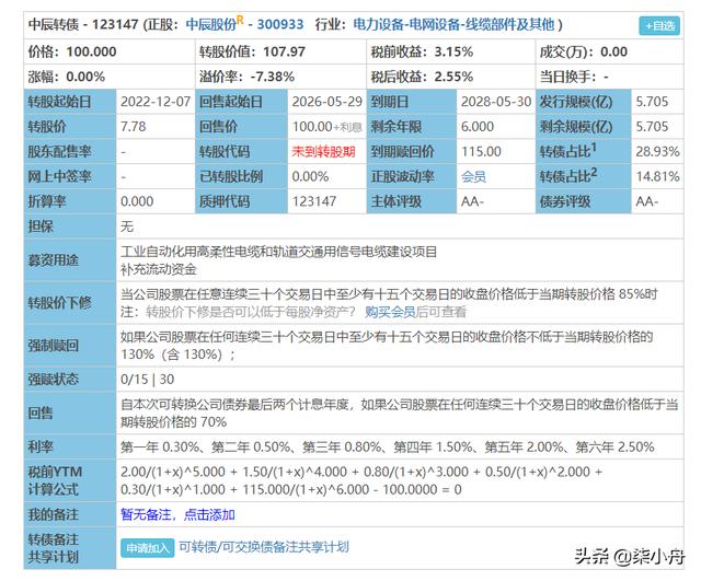 根据当前行情,中辰转债上市时预计会有20%的溢价,其预计上市价值为129.56元。