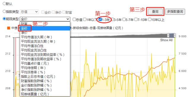 在右侧图表上方,勾选“1-3年”,下拉框选择“全价”,点击“查询”按钮,几秒钟后,就会出现中债指数的近期走势: