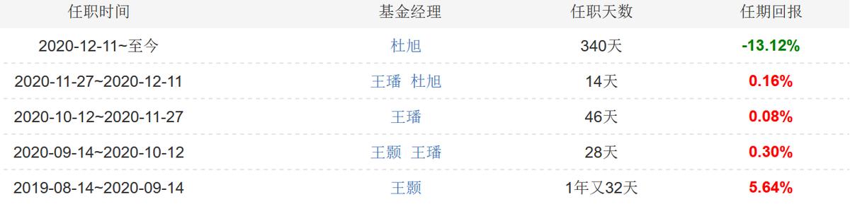 以先锋博盈纯债基金为例,该基金成立于2019年8月,先后经历过三任基金经理,第三任基金经理为目前在管的杜旭。前两任基金经理管理期,收益是正的,而杜旭的管理期内,回报为-13.12%。