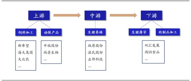 生猪养殖处于产业链中游。从生猪产业链来看,上游主要包括饲料加工和动保产品,饲料加工行业代表企业主要有新希望、海大集团和大北农等,动保产品行业代表企业主要有中牧股份和瑞普生物等。中游主要包括生猪养殖行业,代表企业主要有牧原股份、温氏股份、正邦科技、新希望和傲农生物等。下游主要包括生猪屠宰和肉制品加工,代表企业主要有双汇发展和雨润食品等。
