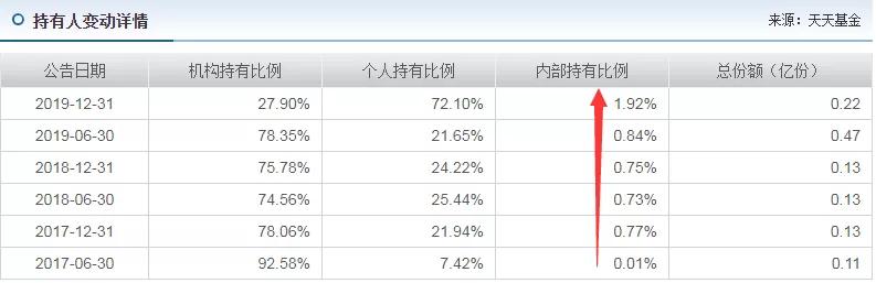 从基金持有人的结构来看,内部员工持有比例增加,由机构持有比例过渡到个人持有比例,也是好事儿(机构对资金要求高,大资金巨额赎回会基金净值会有影响)