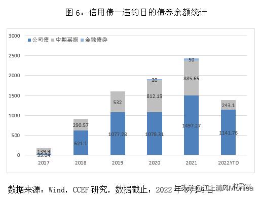 根据近5年违约日的债券余额统计,公司债的累计违约金额远高于中期票据和金融债券。2022年以来,公司债和中期票据违约日的债券余额分别为1141.76亿元、243.1亿元(同期金融债券违约余额目前为0)。