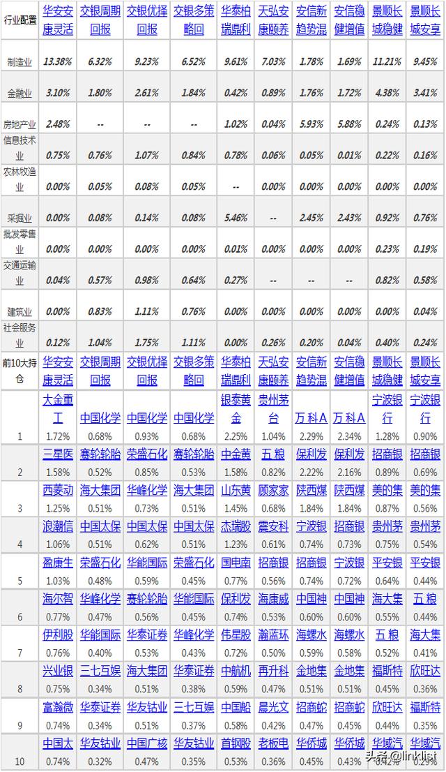 可以看出,规模上,这十只都超过了2亿,因此清盘以及挤兑的风险相对较小,而股票占比上,只有最新的天弘安康占比小于10%,其余都在10%以上,尤其是华安安康达到21.94%,因此华安安康面临着更大的波动性。其次,持股集中度越高,可能的风险和波动也就越大,因此,可以看出华安安康,华泰柏瑞,安信新趋,安信稳健四只超过了10%,但是如果要是分散的话,也没有太大问题。接下来看持股情况。