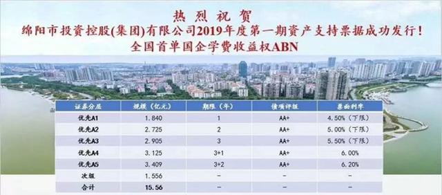 比如,全国首单国企学费收益权ABN---2019年绵阳市投资控股集团有限公司第一期资产支持票据于银行间市场成功发行,发行规模为15.56亿元,其中优先级14.004亿,联合资信AA 评级。