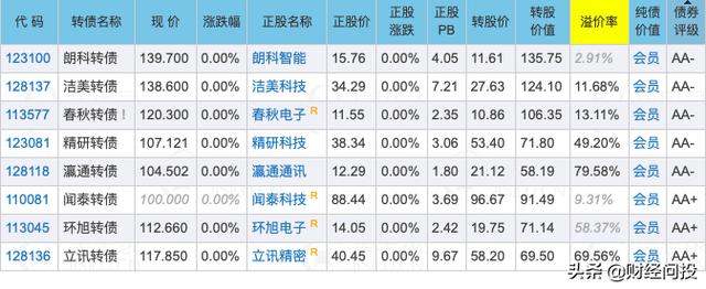 转债上市首日溢价率预估同业转债闻泰科技主营“电子零部件制造”领域,同业转债有环旭转债、立讯转债,我们通过简单的算术平均,得出闻泰转债的近似溢价率。