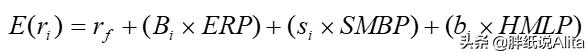 三因素模型的计算公式上式中,为目标证券i的预期报酬率;为无风险报酬率;为公司i的β系数,并不等同于资本资产定价模型中的β系数;ERP为市场风险溢价;