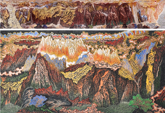 东方的宇宙观,在余先生的笔触下呈现,山通过画家而绘就,画家也成为山的冥想的一部分。他所使用的颜料,源自大地的矿物质,层层叠染,唤起盛唐时期的皇家色彩——朱砂、青金、鎏金。千年前,这些色彩曾随唐朝的公主远嫁吐蕃。